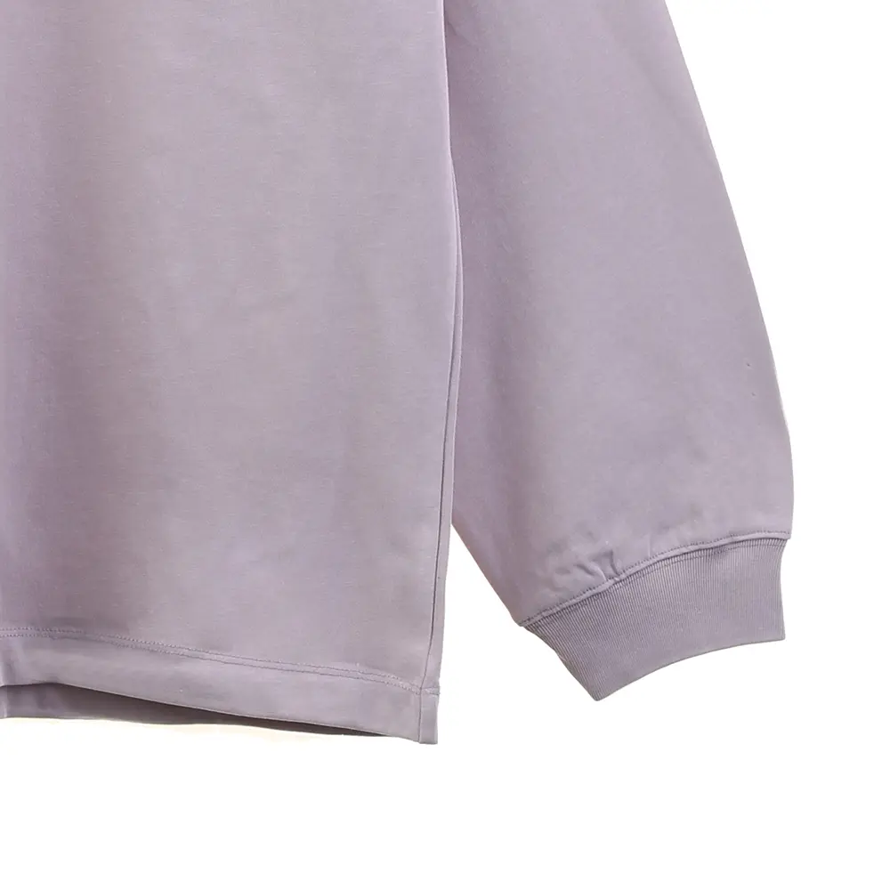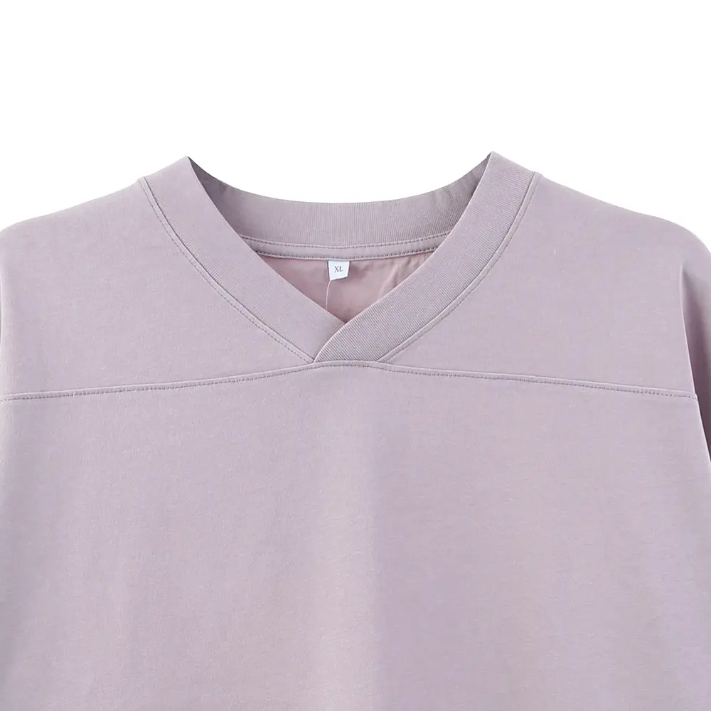 This casual crew neck sweatshirt, produced for our European customers, is made from 100% cotton 260G fabric. Compared to other materials, pure cotton is anti-pilling, more skin-friendly, and less likely to generate static electricity, effectively reducing friction between the clothing and skin. The overall style of the clothing is simple and versatile, with an oversized, loose fit. The collar uses a ribbed material and is cut in a V-shape, which fits the neck perfectly while accentuating the neckline. The raglan sleeve design provides a more relaxed and comfortable wearing experience, greatly enhancing comfort. This sweatshirt has undergone an acid-washing process, which makes the fabric softer as it goes through abrasion and compression during the process. This tightens the bonds between fibers, resulting in a finer texture and a more comfortable feel to the touch, while also giving it a stylishly distressed appearance.