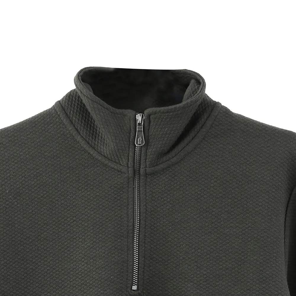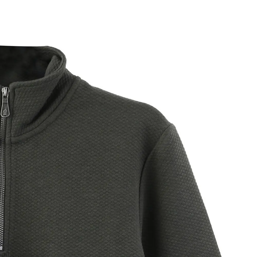 This men’s sweatshirt is made for the K.STEVENS brand.The fabric composition is 71% cotton 27% polyester 2% spandex, the weight per square meter is approximately 290 grams.Jacquard fabrics, through the exquisite application of weaving technology, achieve diversified and artistic textures, presenting rich and colorful patterns and textures on the surface of the fabric. This not only showcases the designer’s creativity, but also meets consumers’ pursuit of fashion and art. Secondly, jacquard fabric exhibits excellent three-dimensional and tactile qualities, with its three-dimensional texture not only enhancing the visual effect of wearing, but also bringing a soft and comfortable feel.The overall design of this sweatshirt is simple and elegant, and the collar adopts a stand-up collar design, which is one of the most prominent features of the stand-up collar sweatshirt. The stand-up collar can modify the neck line, making the neck look longer, while providing good windproof and warming effects. We also added a zipper design on the collar, which makes it very convenient to put on and take off, and can create different styles. The cuffs and hem of the sweatshirt are ribbed fabric, which has a good warmth-retaining effect. The elastic design can tightly lock the cuffs and hem to prevent cold wind from invading, making it especially suitable for outdoor activities in winter.