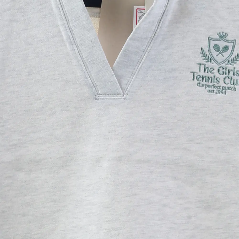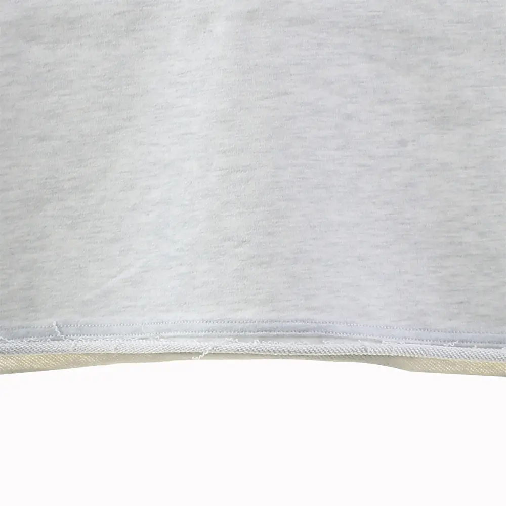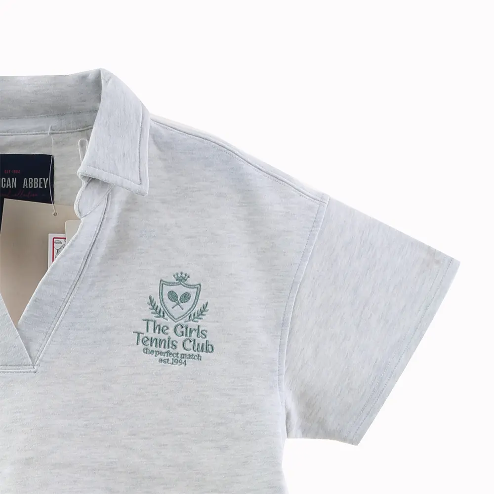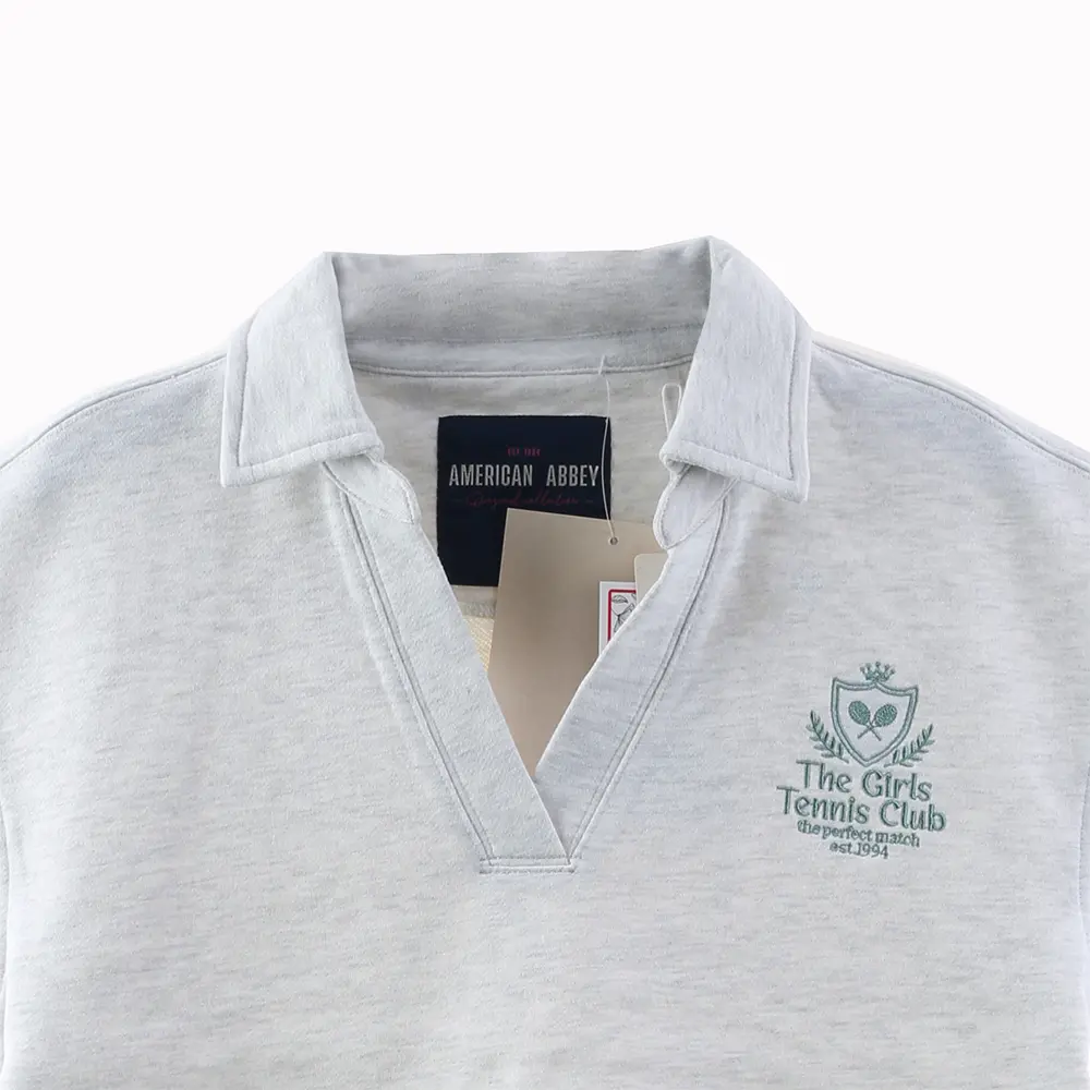 This sweatshirt is custom-made for AMERICAN ABBEY . It uses french terry fabric, which is 60% organic cotton and 40% polyester. The weight of each square meter of fabric is about 300g. The collar of this sweatshirt uses a polo collar, which breaks the casual feeling of traditional sweatshirts and adds a sense of refinement and competence. The neckline adopts a split design, which can add a sense of layering to the clothing, break the monotony of the overall style, and make the clothing more lively and elegant. The sleeves of this sweatshirt are short-sleeved, suitable for spring and summer, and have good breathability. The left chest position is customized with flat embroidery patterns. In addition, 3D embroidery is also a very popular embroidery method. The pattern embroidered by flat embroidery machines are flat, while the pattern embroidered by three-dimensional embroidery machines are three-dimensional and layered, and look more realistic. We customized the brand logo metal label for customers at the hem position, which well reflects the series sense of the clothing brand.