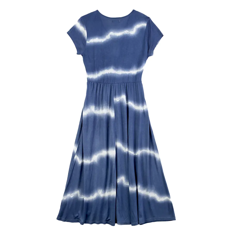 This is an imitation tie-dye women’s long dress, made with 100% viscose single jersey, weighing 160gsm. The fabric is lightweight and has a drapery feel. For the appearance of the dress, we used a water print technique on the fabric to achieve the visual effects of tie-dye. The texture of the fabric is smooth and closely resembles actual tie-dye, while also reducing the material waste compared to traditional tie-dye techniques used on finished garments. This not only lowers costs for our customers but also achieves the desired effects. The dress features cut pieces on both the upper and lower parts as well as on the front and back, giving it a simple yet stylish design. This minimalist design exudes contemporary charm, while guaranteeing optimum comfort for everyday wear. This exquisite masterpiece encapsulates both style and sustainability, offering a modern rendition of the beloved tie-dye technique.
